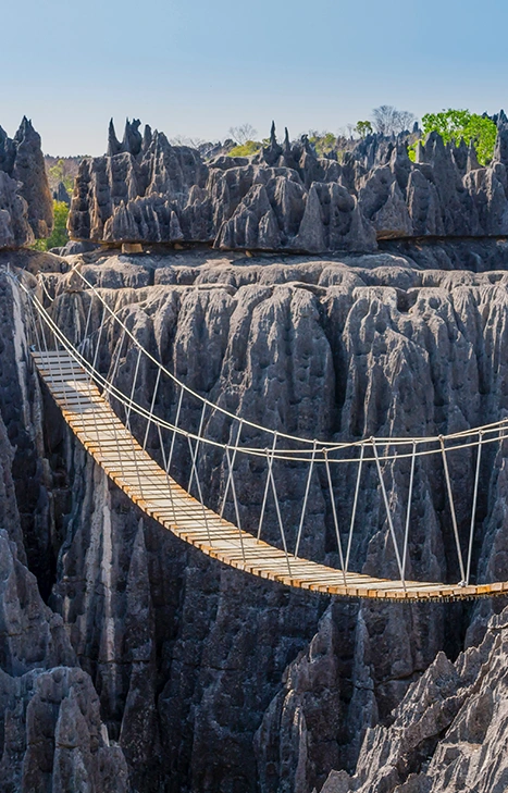 Le parc national des Tsingy de Bemaraha, site classé au patrimoine mondial, propose des parcours sécurisés de via ferrata et des ponts suspendus pour évoluer au milieu de ces formations calcaires acérées.